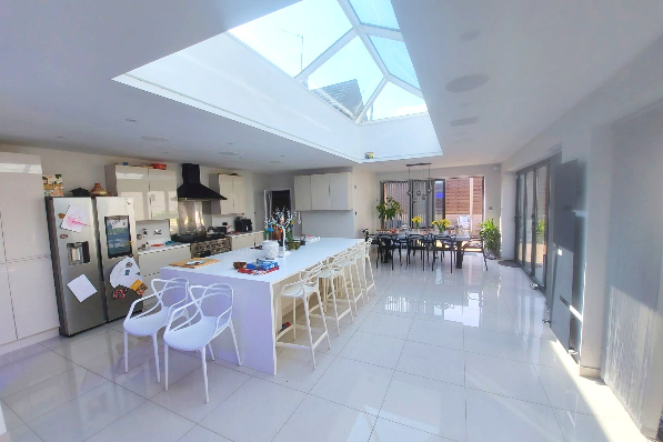 At the rear of the property, the **extension with skylights** is designed to flood the interior with natural light, creating a bright and inviting atmosphere throughout the home. The open-plan kitchen, which sits at the heart of the design, benefits greatly from this infusion of daylight. Combining sleek, modern finishes with spacious design, the kitchen is perfect for both day-to-day family living and entertaining guests, offering a fluid connection between indoor and outdoor living spaces.